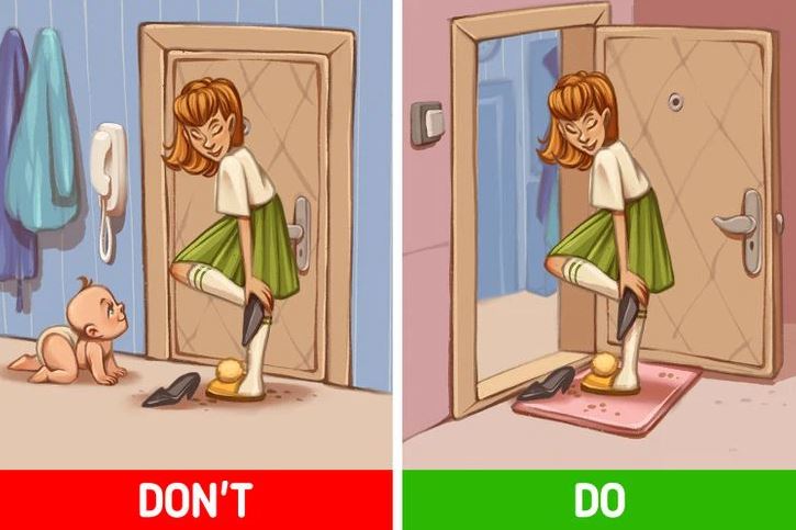 Lý do của việc nên bỏ giày dép ngoài cửa trước khi vào nhà rất đơn giản: Bạn sẽ không để lại vết bẩn, vết bùn trên sàn và thảm trong nhà. Ngoài ra, đế giày là nơi trú ngụ hoàn hảo của vi khuẩn lây nhiễm và bằng cách cởi giày trước khi vào nhà, bạn sẽ giúp bản thân và các thành viên trong gia đình khỏi mắc các bệnh khác nhau.