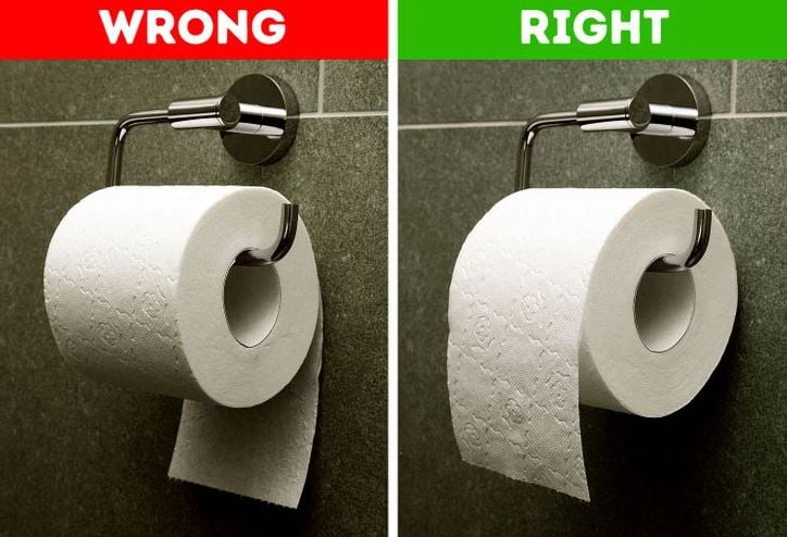 Nhiều người có thói quen đặt cuộn giấy vệ sinh quay vào trong nhưng thực tế, đặt quay ra ngoài có nhiều ưu điểm hơn. Lý do là khi bạn đang ở trong phòng tắm và hết giấy vệ sinh, dùng tay để lấy khi giấy xoay ra ngoài sẽ giúp ít tiếp xúc với khu vực xung quanh hơn. Ngoài ra, giấy cũng không tiếp xúc với tường, là nơi sinh sản vi khuẩn trong nhà vệ sinh.