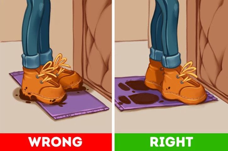 Thảm chùi chân đóng vai trò như một rào cản ngăn bụi bẩn trước khi nó xâm nhập vào nhà. Khi đi qua tấm thảm chùi chân, một lượng bụi bẩn đáng kể sẽ truyền từ thảm sang giày của bạn. Vì thế, bạn nên đặt một tấm thảm chùi chân hình chữ nhật theo chiều dài, không theo chiều rộng. Như vậy bạn sẽ phải bước nhiều bước hơn, và nhiều bụi bẩn cũng sẽ bám lại trên tấm thảm chùi chân. Đây cũng là một thói quen chưa đúng mà nhiều người mắc phải.