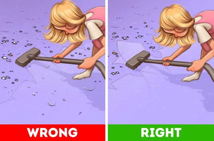 Một sai lầm mà chúng ta mắc phải khi hút bụi là chỉ di chuyển máy hút bụi theo một hướng hoặc di chuyển nhanh qua lại. Các chuyên gia vệ sinh khuyên rằng nên hút bụi theo cả hai hướng, nhưng theo hàng: Đầu tiên, bạn di chuyển máy hút bụi đến cuối hàng. Tiếp theo lật tấm thảm lên và hút bụi trở lại cùng hàng đó. Sử dụng kỹ thuật này, bạn có thể hút bụi toàn bộ căn phòng một cách dễ dàng và hiệu quả. Thói quen chưa đúng này nhiều người cũng hay mắc phải.