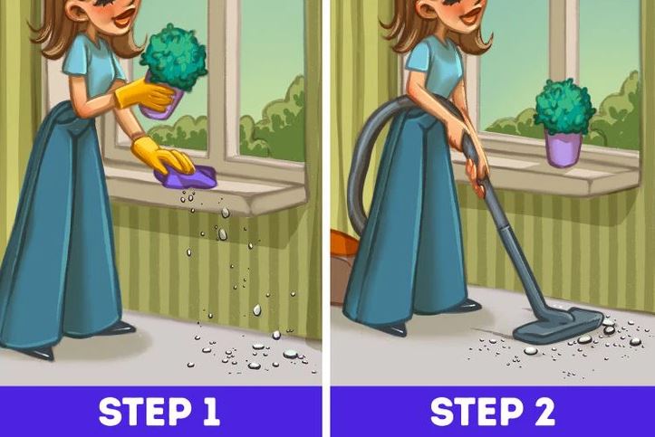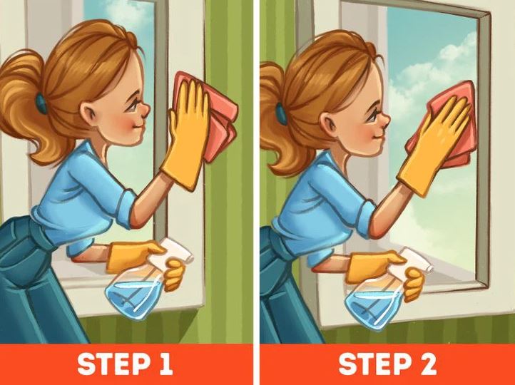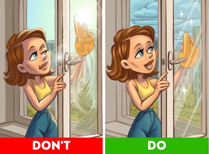 Trong khi lau cửa sổ, bạn nên nhớ rằng ô cửa sổ, cũng như ngưỡng cửa, là nơi chứa nhiều bụi bẩn nhất. Bước đầu tiên không phải là làm sạch ô cửa sổ mà là loại bỏ tất cả bụi bẩn bám trên khung và ngưỡng cửa sổ bằng máy hút bụi và sau đó vệ sinh ô cửa sổ bằng dung dịch tẩy rửa. Chỉ khi các khung đã sạch, các ô cửa sổ mới nên được rửa sạch. Nếu bạn làm điều đó ngược lại, bụi bẩn từ khung sẽ dính vào ô cửa mới được làm sạch và bạn sẽ phải vệ sinh lại nhiều lần.