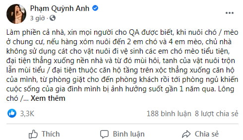 Cụ thể, cô than phiền về việc hàng xóm thiếu ý thức khi nuôi thú cưng. Phạm Quỳnh Anh cho biết, trong khu chung cư mình đang ở, phía trên có một hộ nuôi thú cưng nhưng không biết sử dụng biện pháp vệ sinh, khiến căn hộ của cô ở dưới bị ô nhiễm mùi nghiêm trọng. ‘Ban quản lý lên nhà gõ cửa, lập đến hàng chục tấm biên bản, vào tận căn hộ chụp hình và các bạn bước ra cảm thấy mắc ói vì mùi hôi, sau mỗi lần như vậy, chủ nhà ký xác nhận rút kinh nghiệm nhưng gần 1 năm rồi tình trạng vẫn không có gì thay đổi’, Phạm Quỳnh Anh bức xúc. Nữ ca sĩ chắc sẽ cân nhắc đến việc chuyển nhà